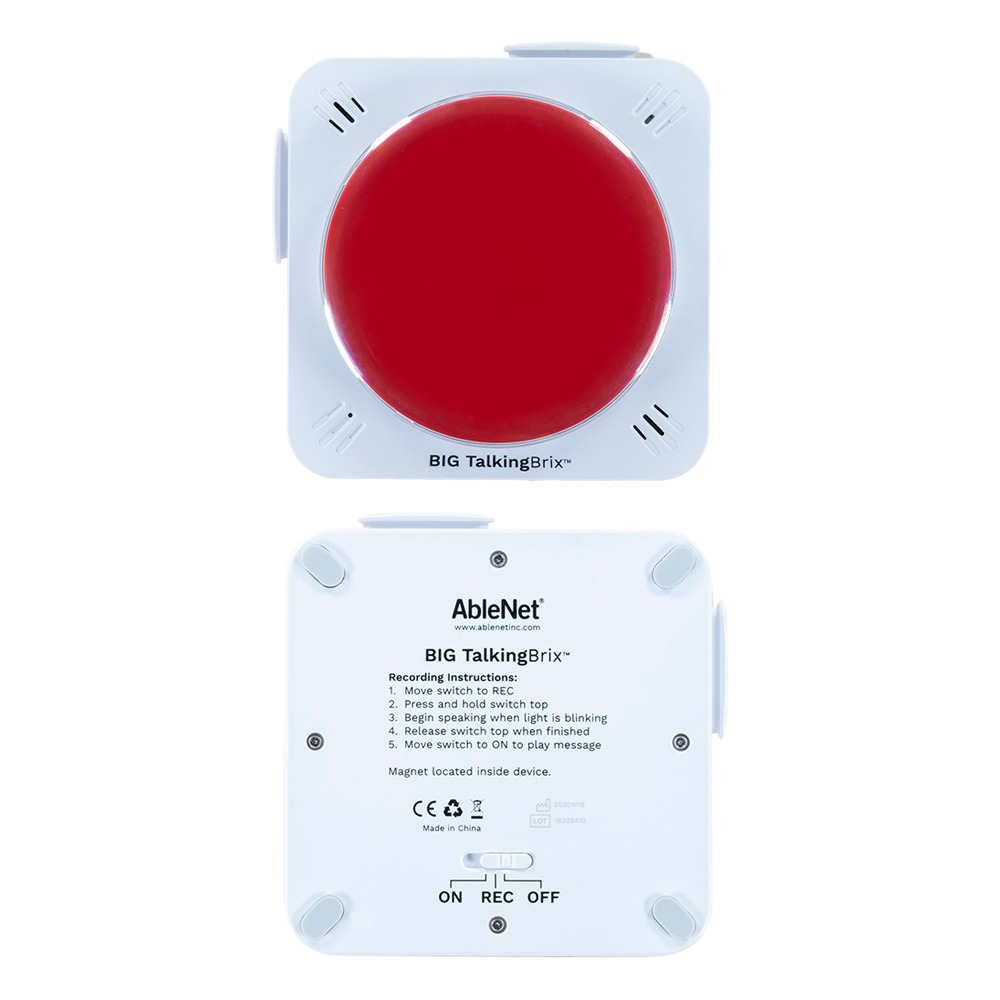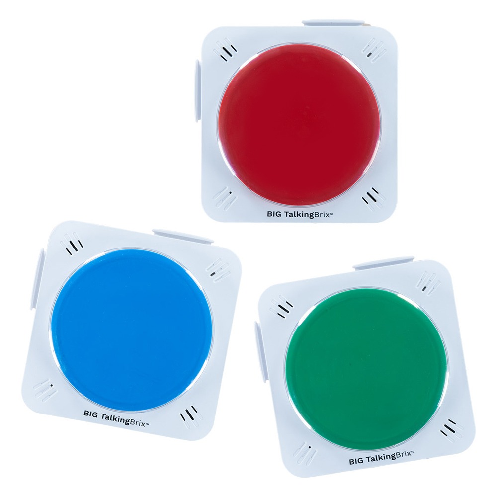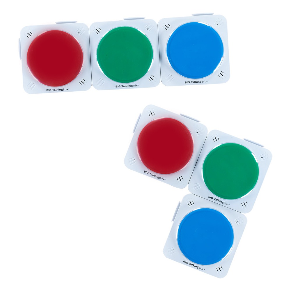BIG TalkingBrix innehåller 3 st talknappar i storleken 88 mm. Du kan använda dem en och en eller koppla ihop dem med varandra för att få ett kommunikationshjälpmedel med flera alternativ.