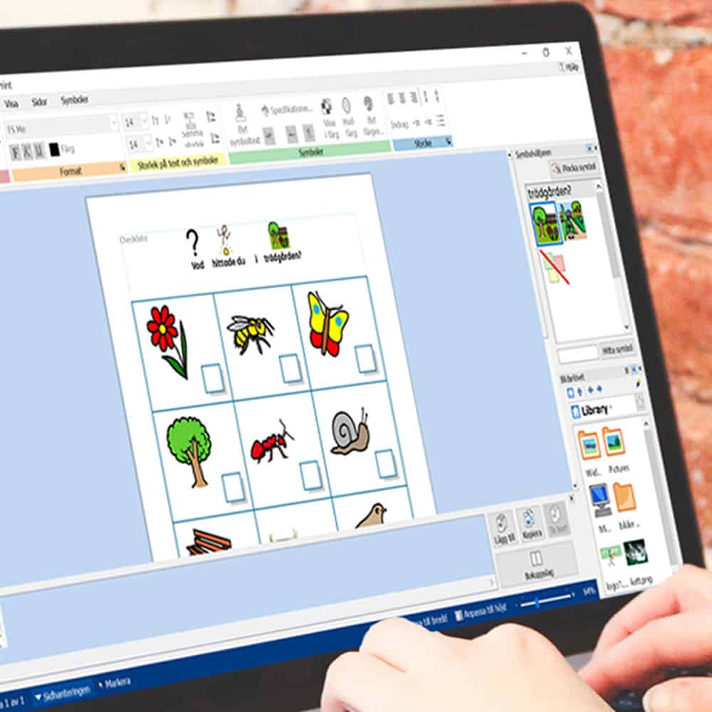 InPrint 3 innehåller ca 20 000 svenska Widgitsymboler och bilder i Widgit Media, och du kan dessutom lägga till egna bilder, fotografier och bildbaser. I det nya gränssnittet får du tillgång till snabba och intuitiva redigeringsverktyg i flikar och högerklicksmenyer.