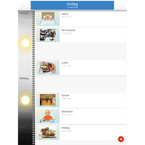 Dagsschemat visar dagens händelser. Schemat är indelat i sektionerna morgon, dag och kväll. En tidslinje visar hur långt in på dagen du har kommit. I veckoschemat kan du se alla händelser som har skapats för att visas i denna vy. Du kan lägga in aktiviteter som upprepas varje vecka, till exempel att packa gympapåsen en viss dag i veckan.