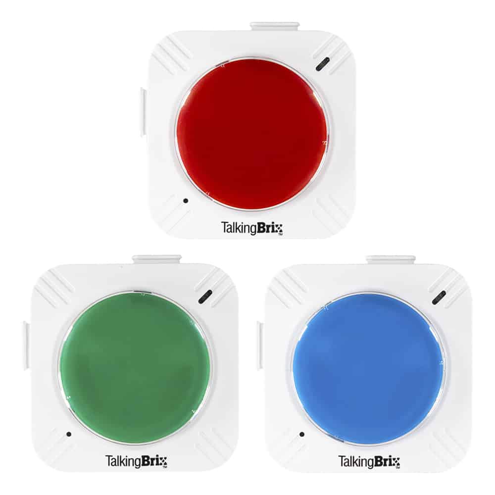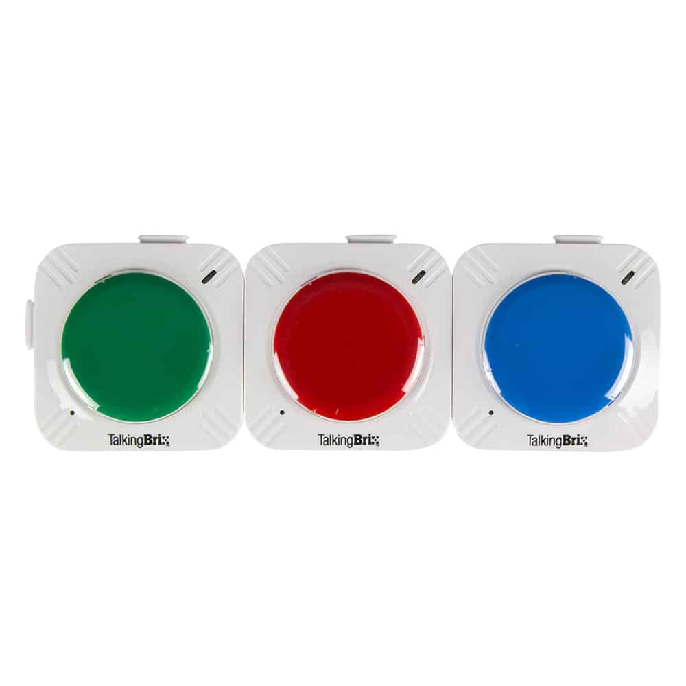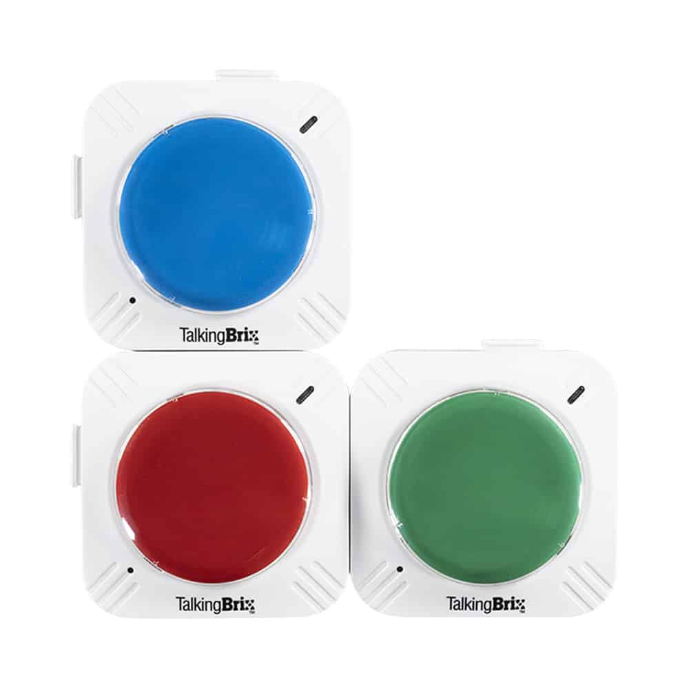 Talking Brix kan användas individuellt eller fästas i varandra. Fäster du dem i varandra får du på så sätt ett kommunikationshjälpmedel som består av flera olika knappar.